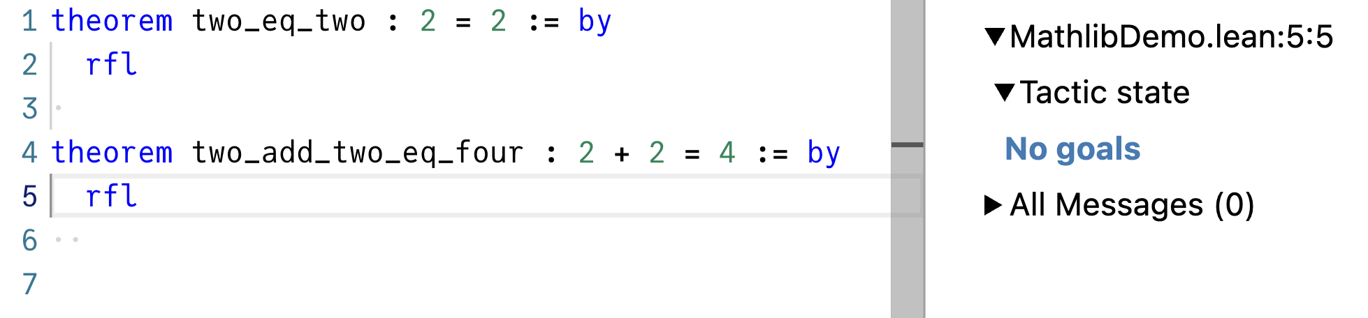 Here, two_eq_two_again delegates the rest of the proof to two_eq_two because the current goal (⊢ 2 = 2) is exactly what two_eq_two already proves. (To a programmer’s eye, this might look like returning the result of a function call.)