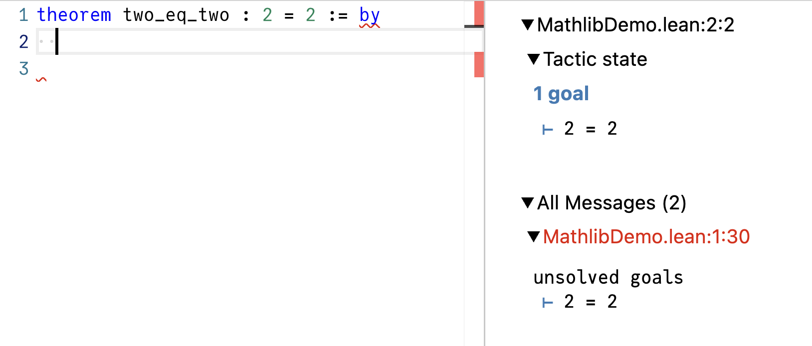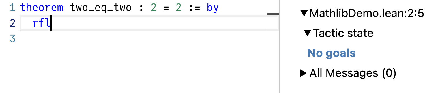 Now you see that the proof is incomplete, and the goal is unsolved. To actually prove 2 = 2, type rfl on the next line, which will successfully close the goal: