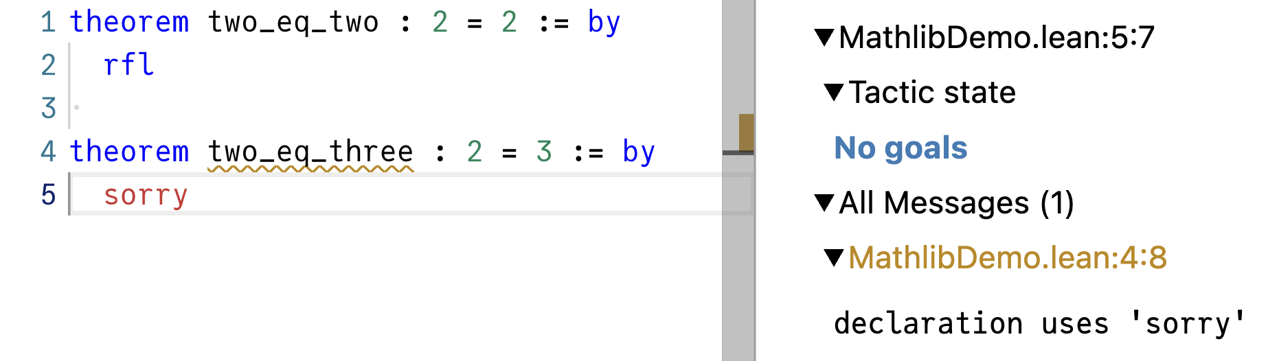 To a mathematician’s eye, this syntax looks like stating a theorem. We have the theorem keyword, the name of our theorem, a colon : before its statement, the statement that we’d like to prove, and := by followed by the proof (sorry means that we haven’t completed the actual proof yet but we’re planning to fill it in later).
