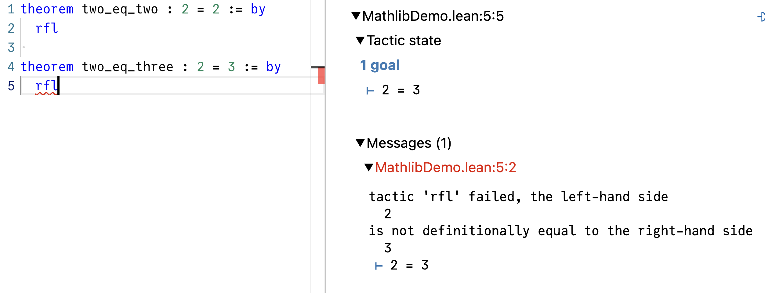 Not so easy now! You could close ⊢ 2 = 2 with rfl because 2 = 2 is shaped like something = something. However, the goal ⊢ 2 = 3 is not shaped like something = something, and therefore rfl does not close the ⊢ 2 = 3 goal.