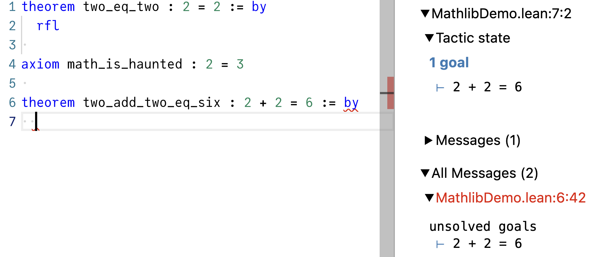 Here, the goal of two_eq_three happens to be exactly the same as the statement of the math_is_haunted axiom, so we’re using the exact tactic to close the goal.
