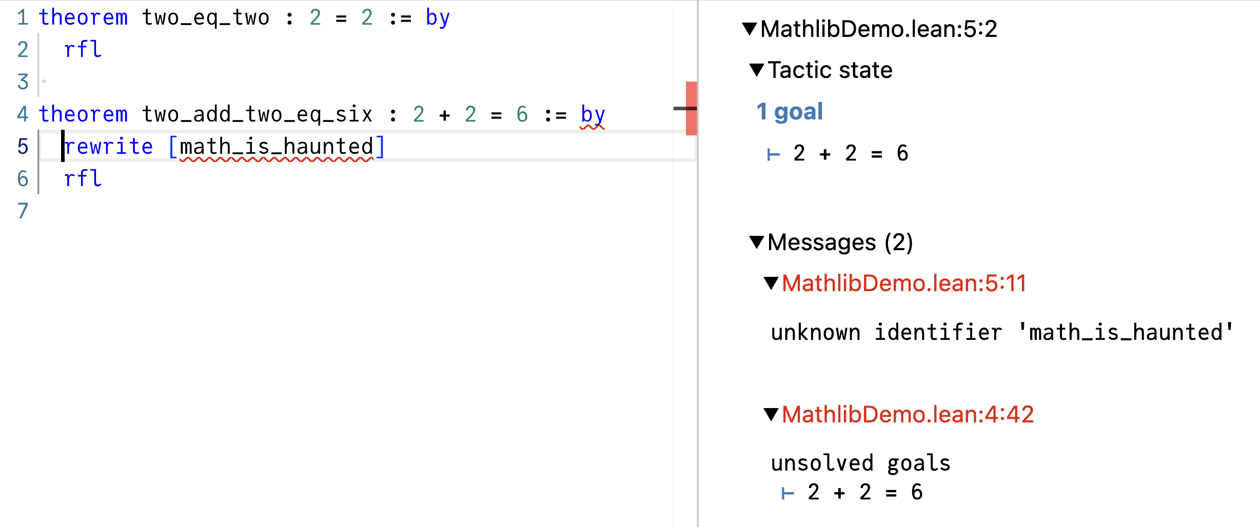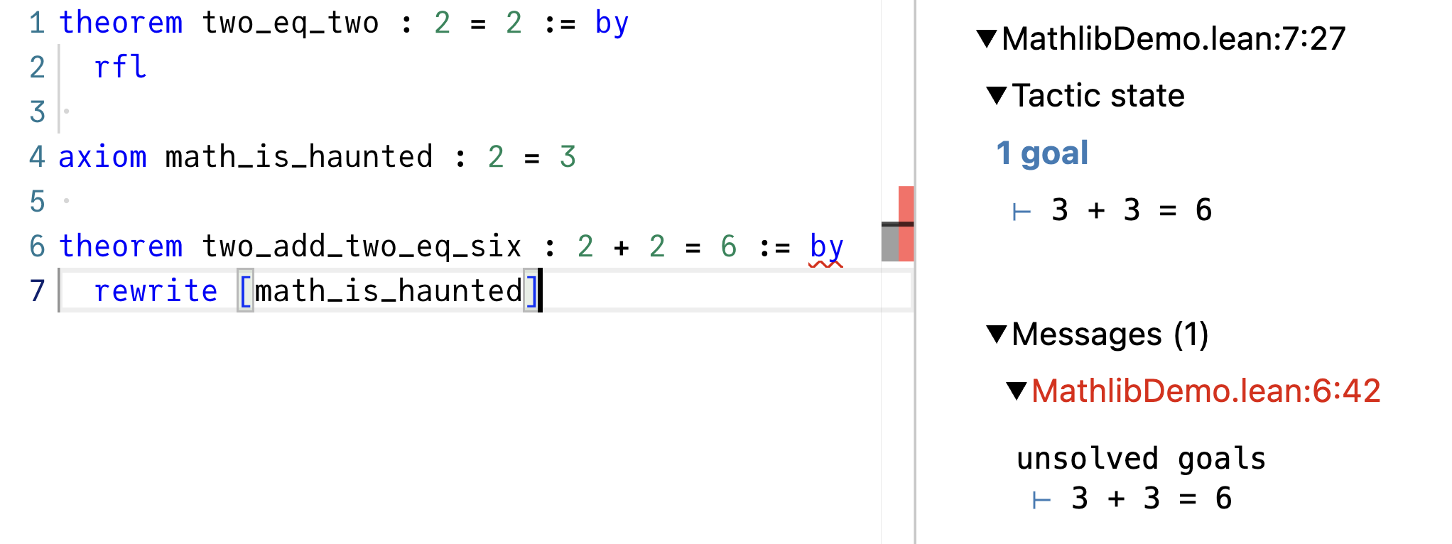 The rewrite tactic is like a “find and replace” within your goal. If you have a proof that a = b, giving that proof to rewrite will rewrite your goal so that all a become b instead. Since math_is_haunted “proves” that 2 = 3, rewrite [math_is_haunted] turns the goal from ⊢ 2 + 2 = 6 into ⊢ 3 + 3 = 6.